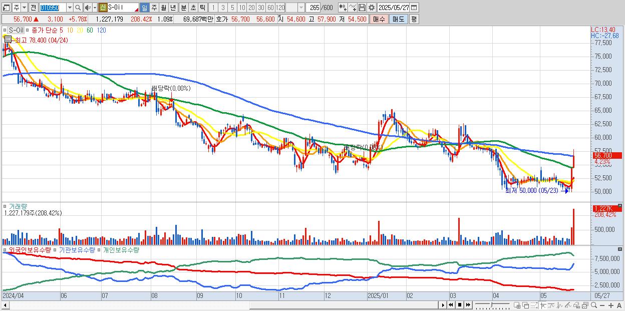 - S-Oil (56,500원 ▲ 5.41% , 시총: 63,609억, 외국인 순매수 거래금:43억)