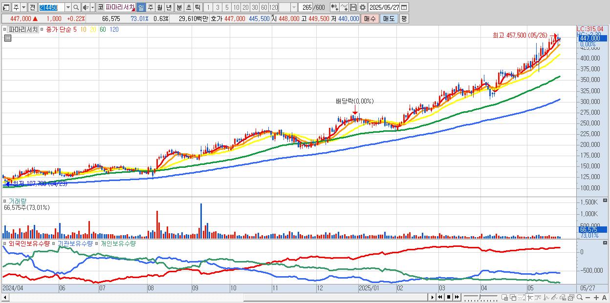 - 파마리서치 (449,000원 ▲ 0.67% , 시총: 47,188억, 외국인 순매수 거래금:63억)