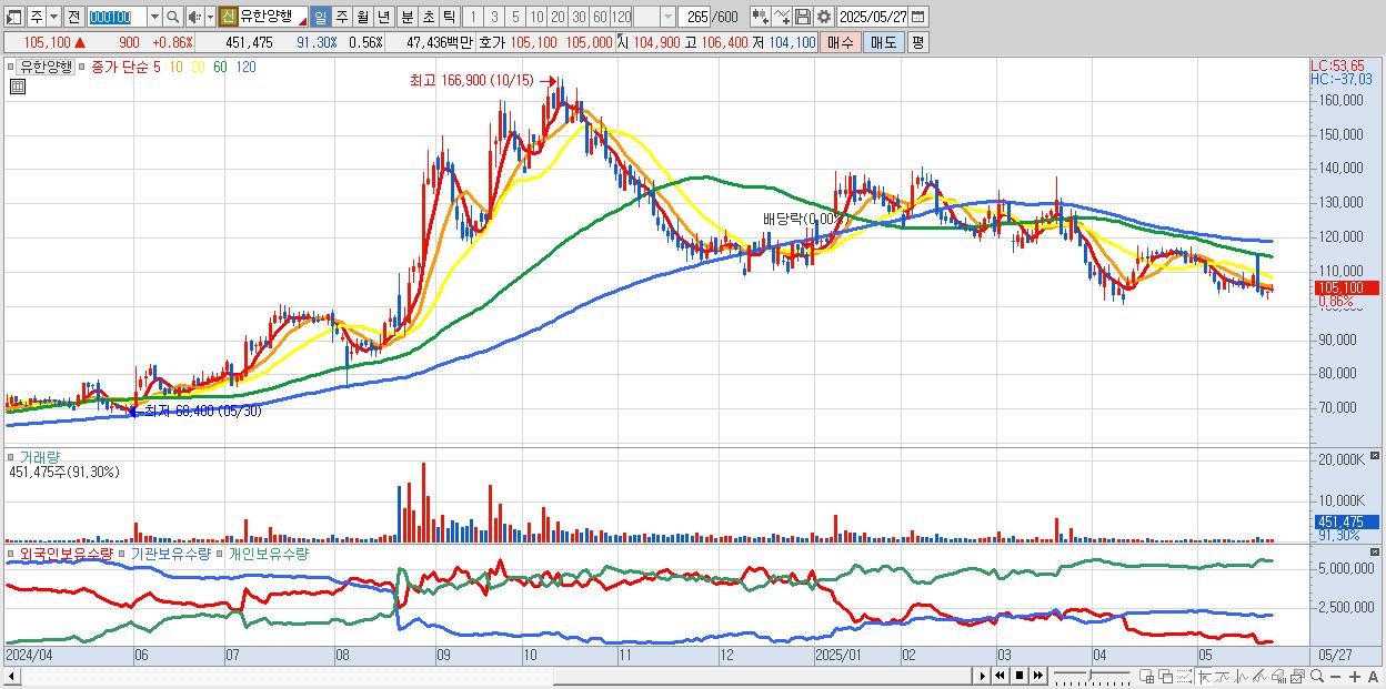 - 유한양행 (105,200원 ▲ 0.96% , 시총: 84,380억, 외국인 순매수 거래금:51억)