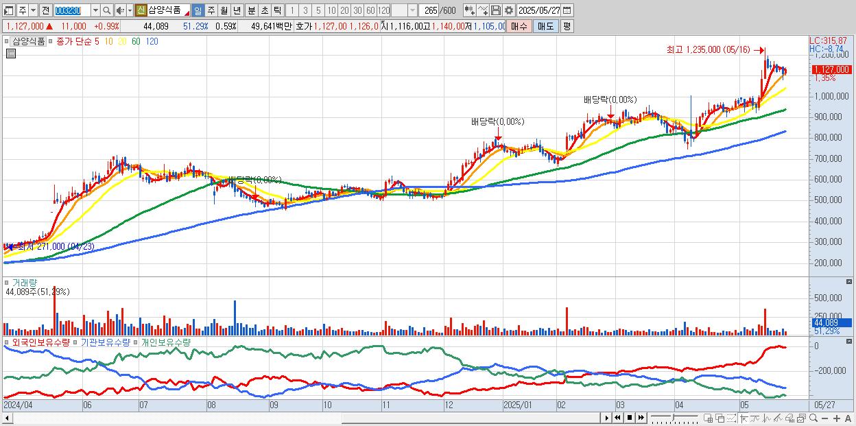 - 삼양식품 (1,129,000원 ▲ 1.16% , 시총: 85,048억, 외국인 순매수 거래금:71억)