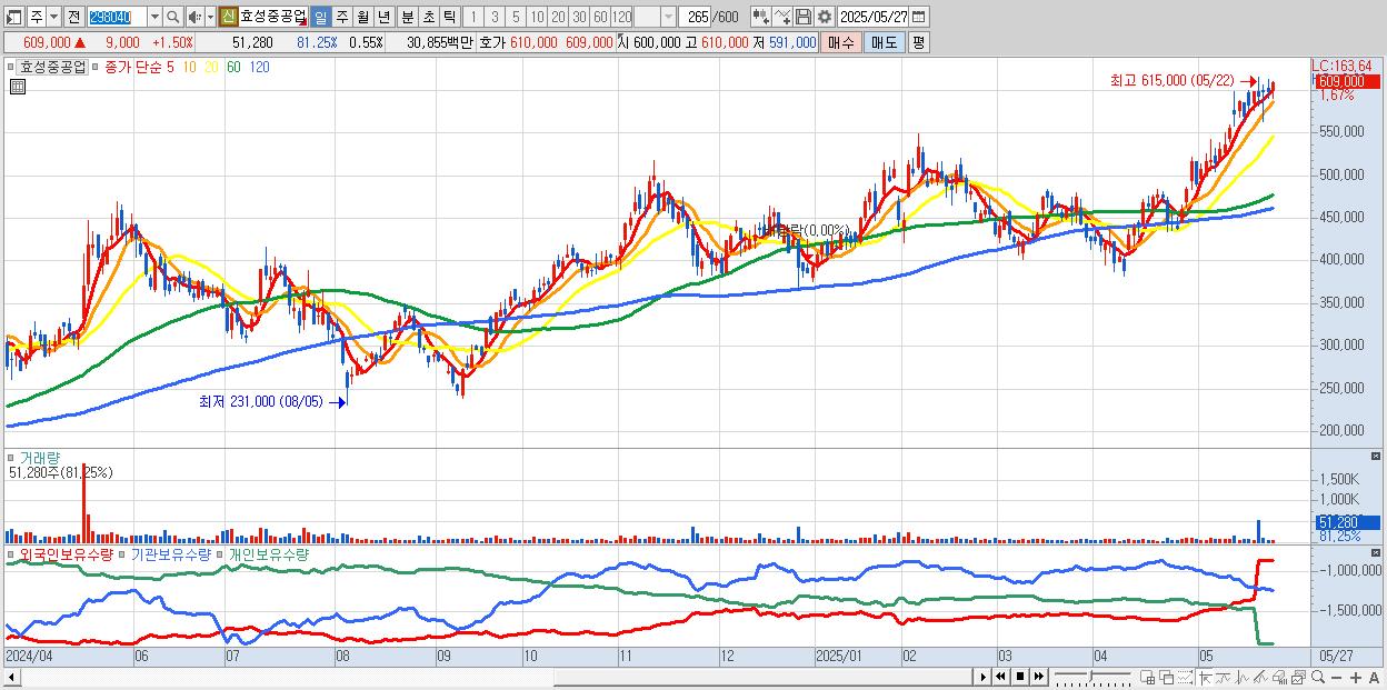 - 효성중공업 (609,000원 ▲ 1.5% , 시총: 56,786억, 외국인 순매수 거래금:60억)