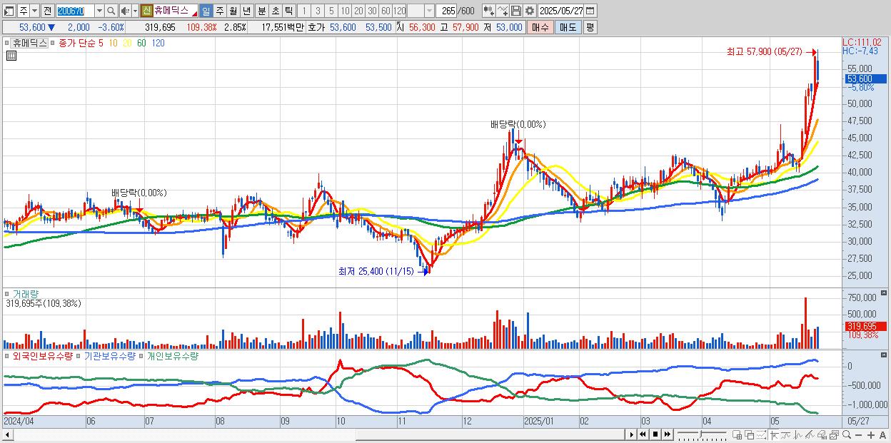 - 휴메딕스 (53,700원 ▼ -3.42% , 시총: 6,030억, 외국인 순매수 거래금:40억)