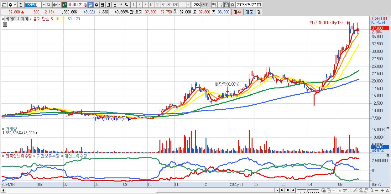 - 비에이치아이 (37,550원 ▲ 1.49% , 시총: 11,620억, 외국인 순매수 거래금:64억)
