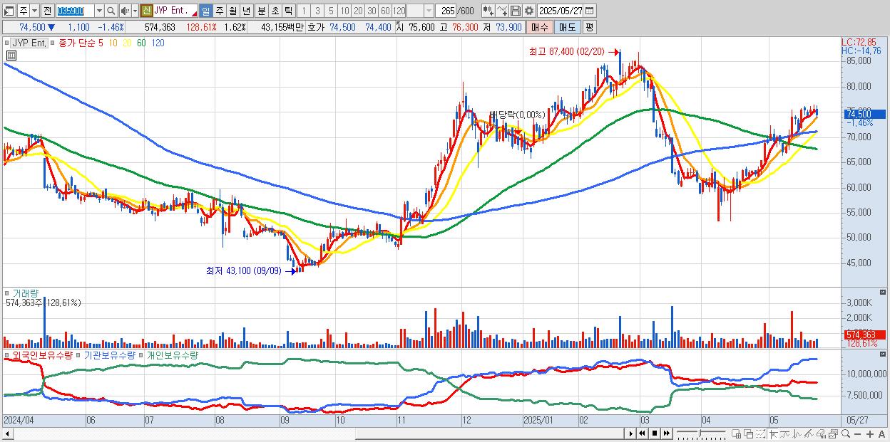 - JYP Ent. (74,600원 ▼ -1.32% , 시총: 26,507억, 외국인 순매수 거래금:39억)