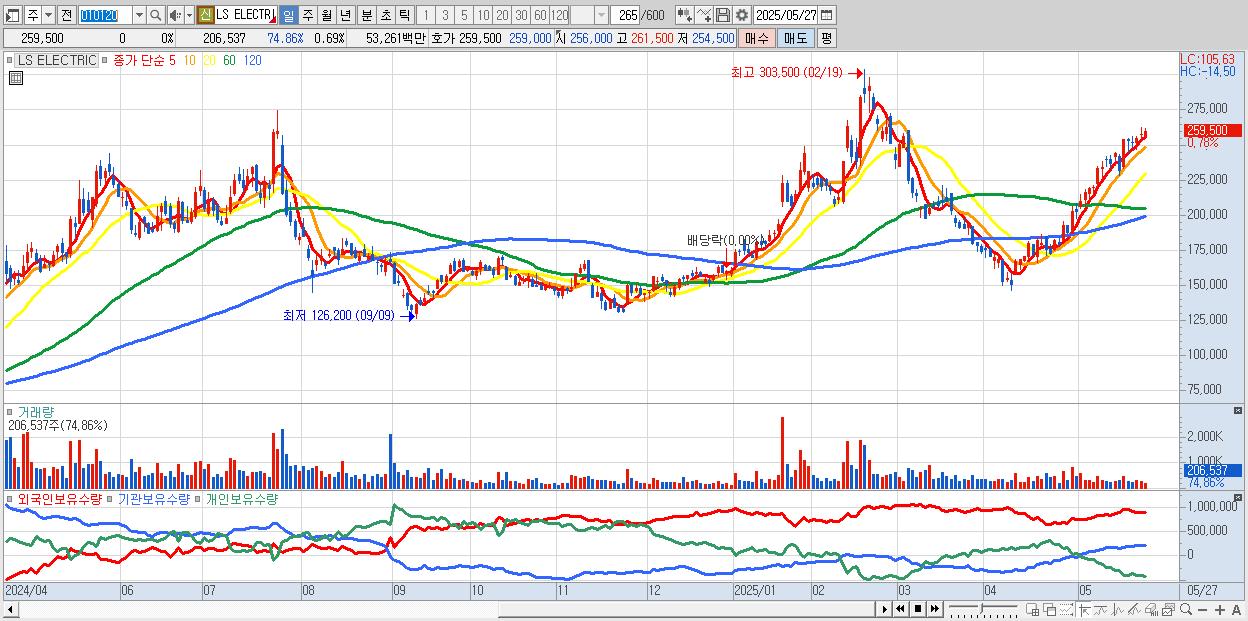 - LS ELECTRIC (259,500원 0% , 시총: 77,850억, 외국인 순매수 거래금:65억)