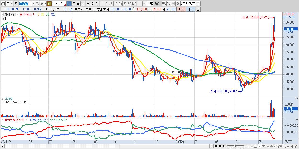 - 삼성물산 (150,500원 ▼ -1.05% , 시총: 255,815억, 거래량: 991,515, 거래대금:1,515억)