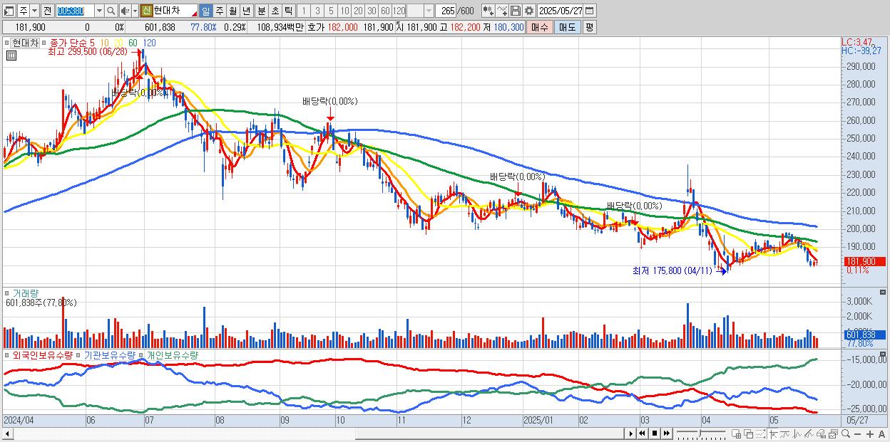 - 현대차 (181,900원 0% , 시총: 372,454억, 거래량: 502,985, 거래대금:910억)