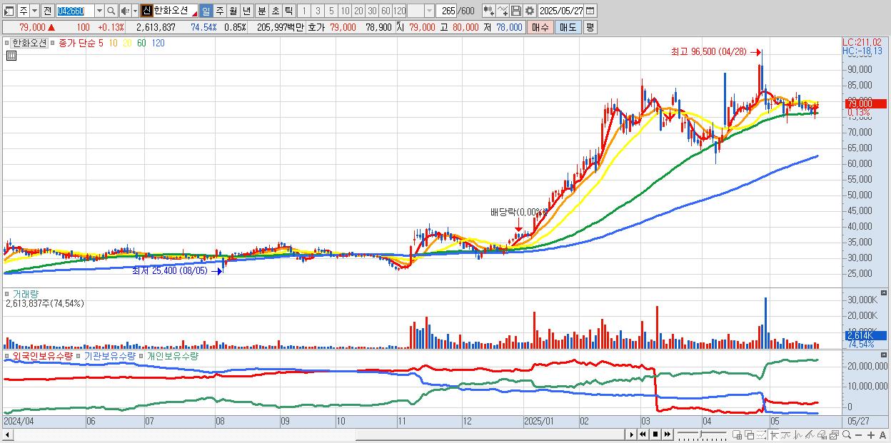 - 한화오션 (78,800원 ▼ -0.13% , 시총: 241,454억, 거래량: 1,500,108, 거래대금:1,182억)