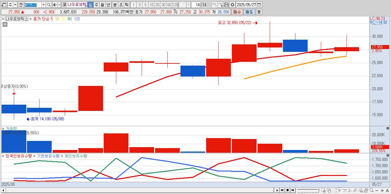 - 나우로보틱스 (27,950원 ▲ 2.95% , 시총: 3,507억, 거래량: 3,687,631, 거래대금:1,064억)