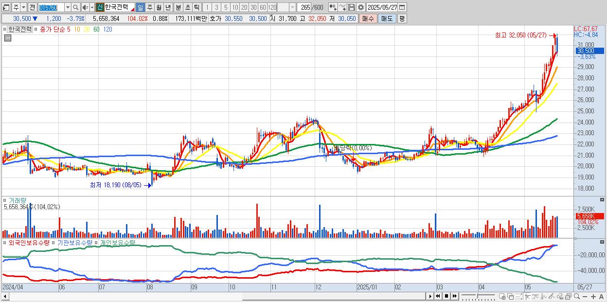 - 한국전력 (30,600원 ▼ -3.47% , 시총: 196,441억, 거래량: 3,499,829, 거래대금:1,069억)