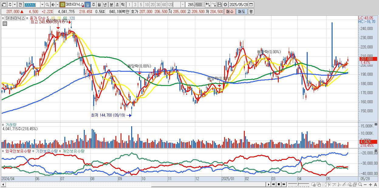 - SK하이닉스 (208,000원 ▲ 2.72% , 시총: 1,514,245억, 거래량: 3,161,188, 거래대금:6,574억)