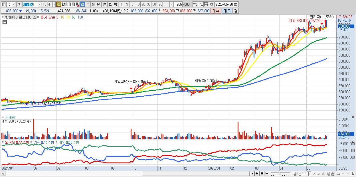 - 한화에어로스페이스 (832,000원 ▼ -6.2% , 시총: 393,504억, 거래량: 320,783, 거래대금:2,753억)