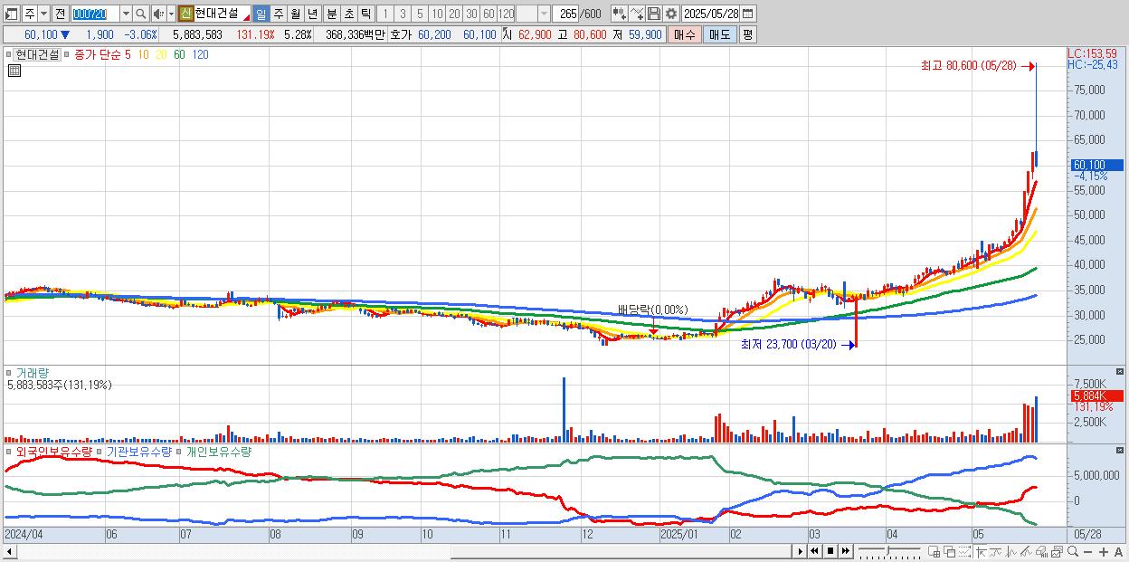 - 현대건설 (60,800원 ▼ -1.94% , 시총: 67,704억, 거래량: 3,617,677, 거래대금:2,257억)