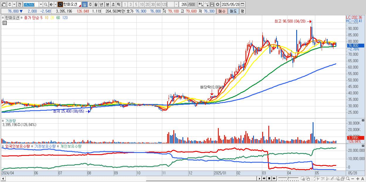 - 한화오션 (76,500원 ▼ -2.92% , 시총: 234,406억, 거래량: 2,049,074, 거래대금:1,596억)