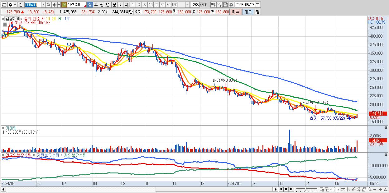 - 삼성SDI (174,100원 ▲ 8.68% , 시총: 119,719억, 거래량: 1,002,912, 거래대금:1,707억)