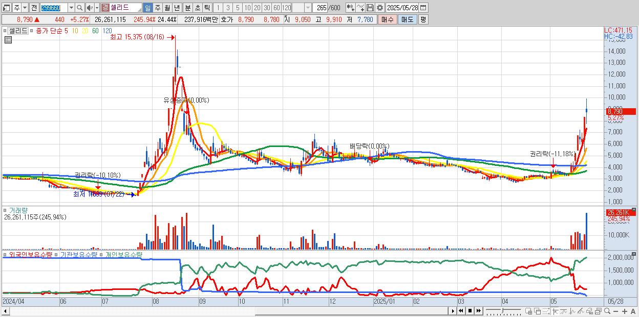 - 셀리드 (8,790원 ▲ 5.27% , 시총: 1,855억, 거래량: 26,261,115, 거래대금:2,379억)