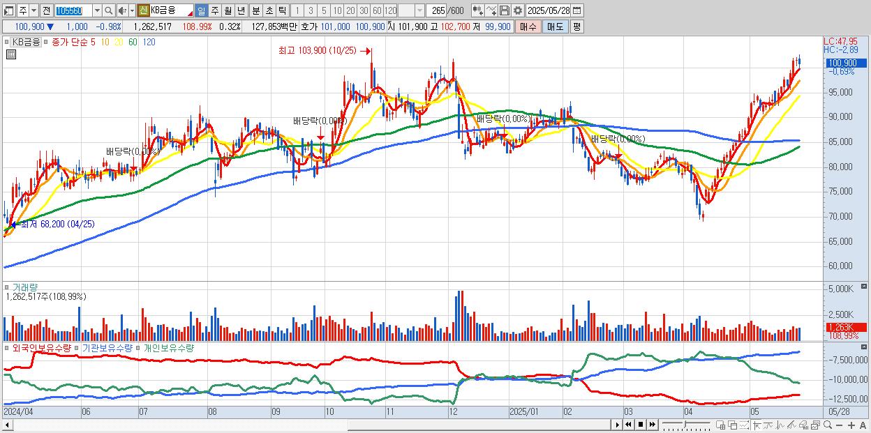 - KB금융 (101,000원 ▼ -0.88% , 시총: 397,464억, 거래량: 1,177,541, 거래대금:1,193억)