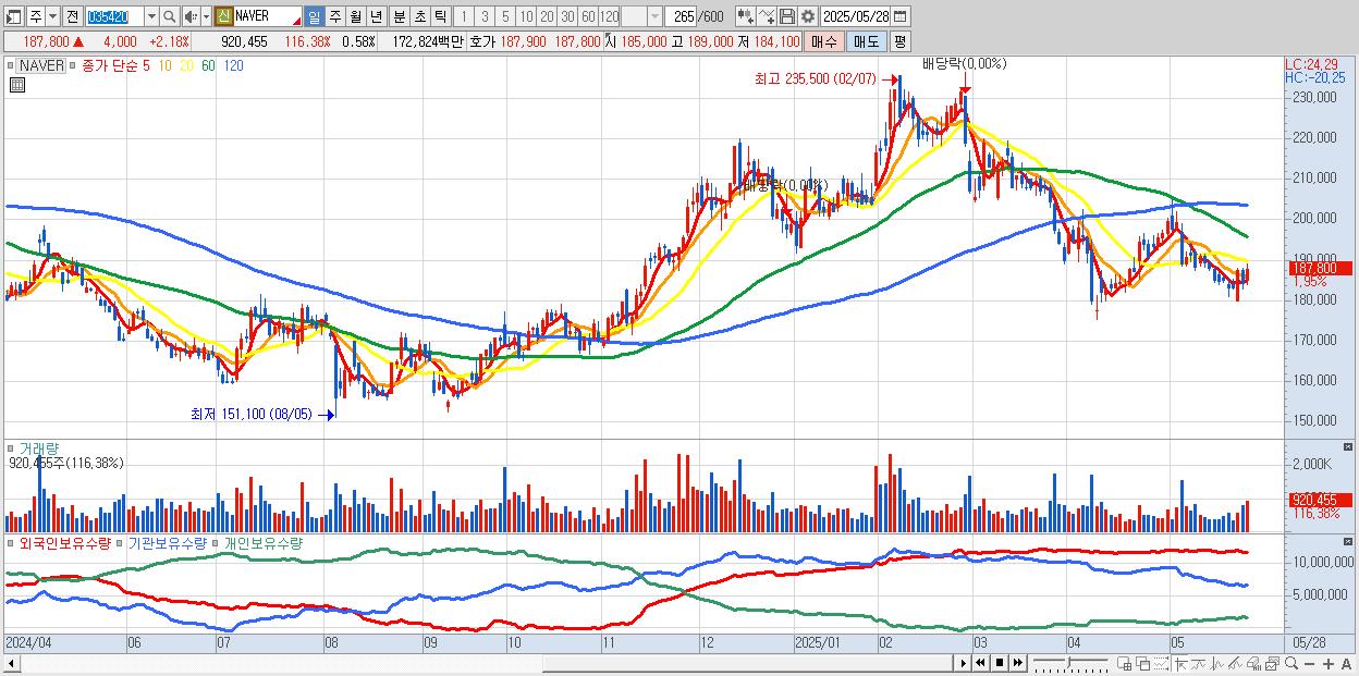 - NAVER (187,700원 ▲ 2.12% , 시총: 297,386억, 거래량: 727,369, 거래대금:1,366억)