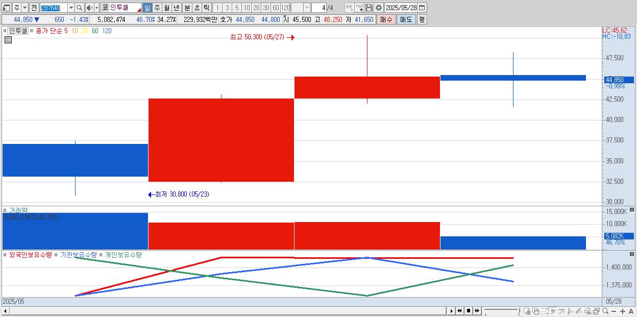 - 인투셀 (46,700원 ▲ 2.64% , 시총: 6,925억, 거래량: 2,735,083, 거래대금:1,237억)