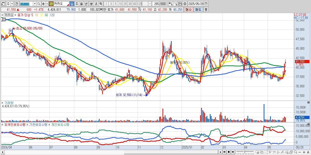 - 카카오 (41,700원 ▲ 1.83% , 시총: 184,194억, 거래량: 2,787,745, 거래대금:1,159억)