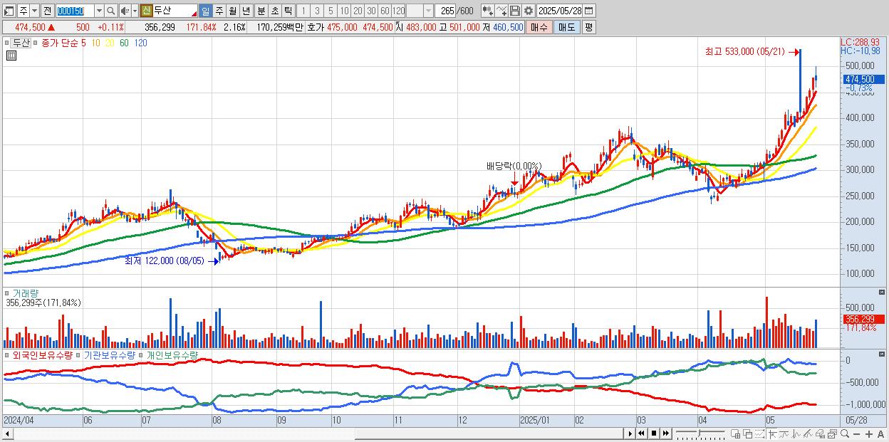 - 두산 (469,500원 ▼ -0.95% , 시총: 77,579억, 거래량: 260,985, 거래대금:1,244억)