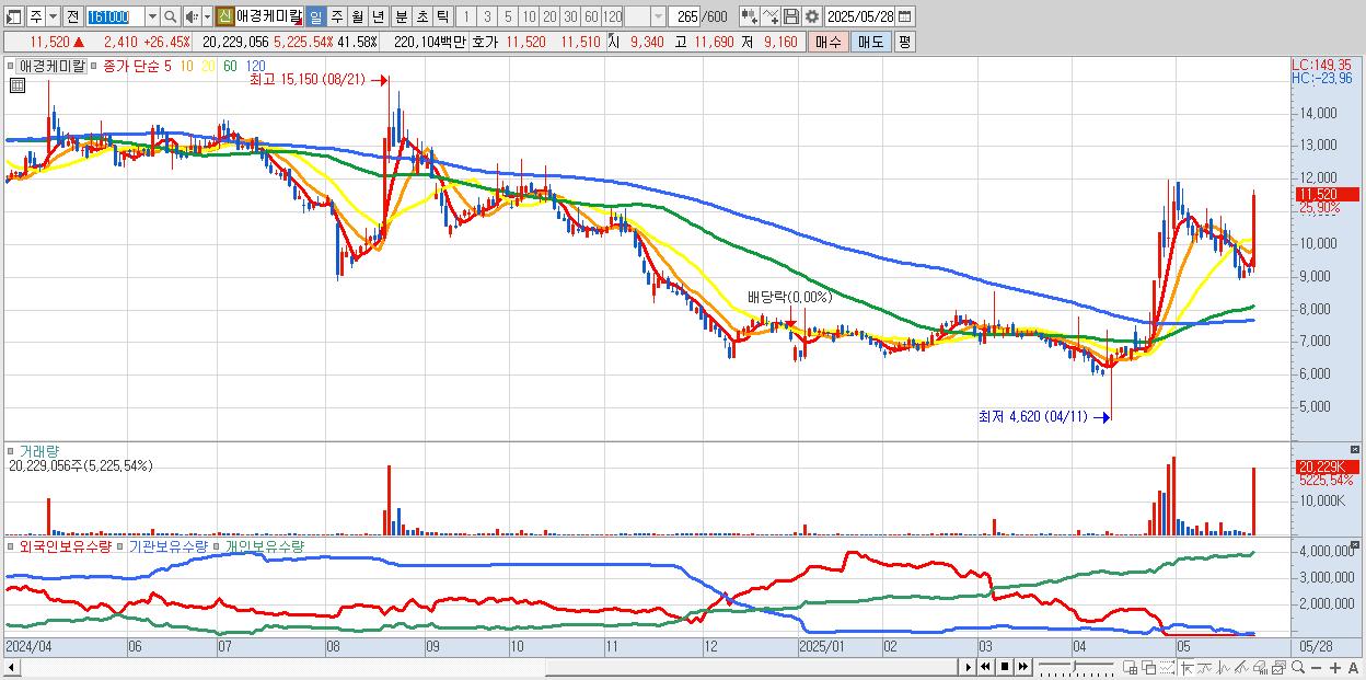 - 애경케미칼 (11,470원 ▲ 25.91% , 시총: 5,580억, 거래량: 12,228,344, 거래대금:1,328억)