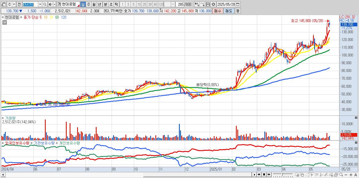 - 현대로템 (139,300원 ▼ -1.35% , 시총: 152,035억, 거래량: 1,883,965, 거래대금:2,651억)