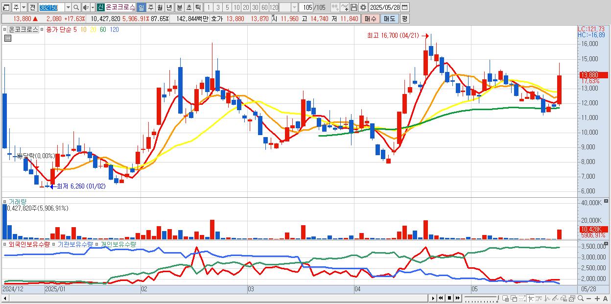 - 온코크로스 (13,880원 ▲ 17.63% , 시총: 1,651억, 거래량: 10,427,820, 거래대금:1,428억)