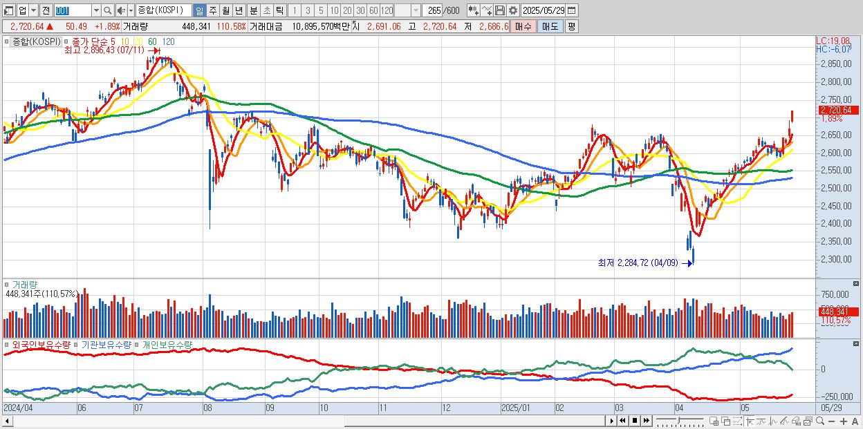 | 05/16 | 2,626.87 | ▲0.21% | -2,823억 | 1,694억 | 1,134억 | -5억 |