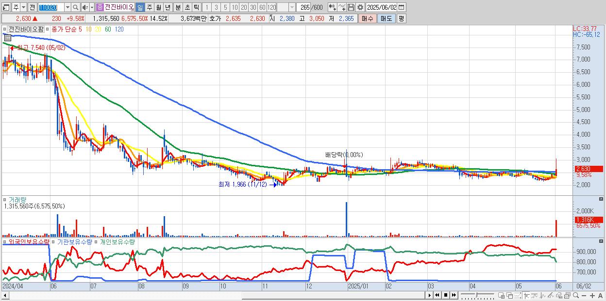 - 전진바이오팜 (2,630원 ▲ 9.58% , 시총: 238억, 거래량: 1,315,560, 거래대금:37억)