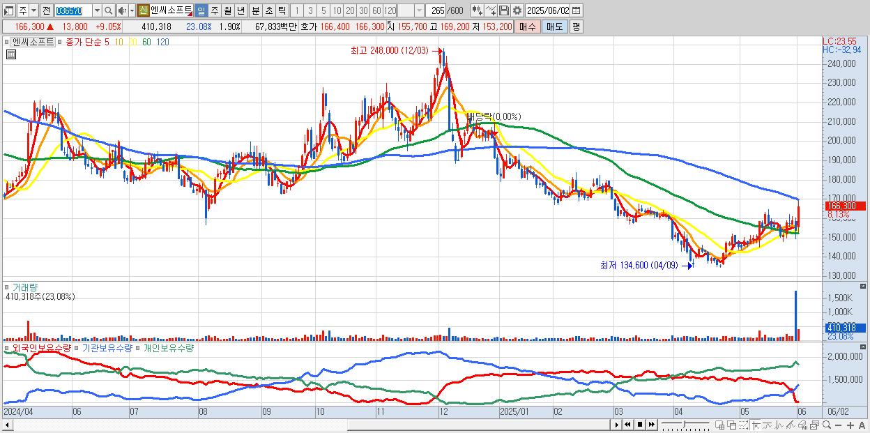 - 엔씨소프트 (166,500원 ▲ 9.18% , 시총: 35,871억, 거래량: 330,236, 거래대금:546억)