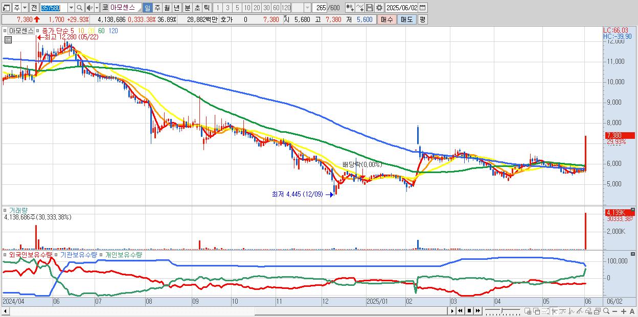 - 아모센스 (7,380원 ▲ 29.93% , 시총: 828억, 거래량: 4,138,686, 거래대금:289억)