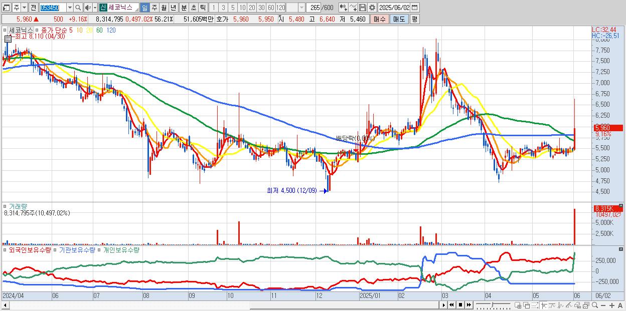 - 세코닉스 (5,960원 ▲ 9.16% , 시총: 882억, 거래량: 8,314,795, 거래대금:516억)