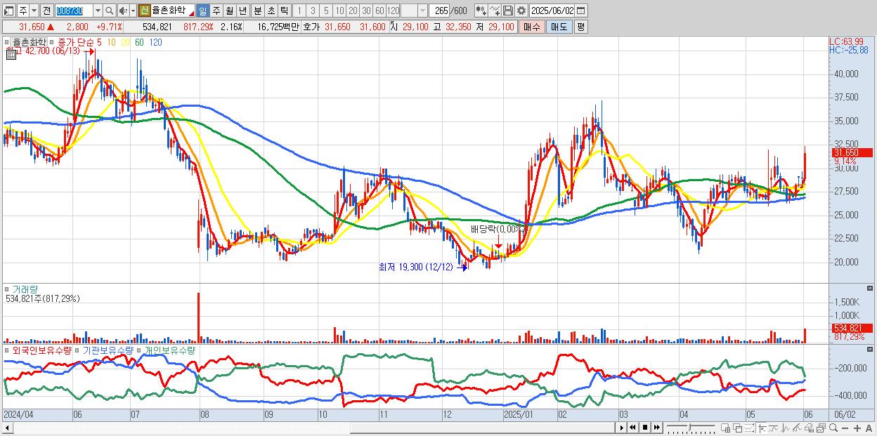 - 율촌화학 (31,600원 ▲ 9.53% , 시총: 7,837억, 거래량: 305,692, 거래대금:96억)