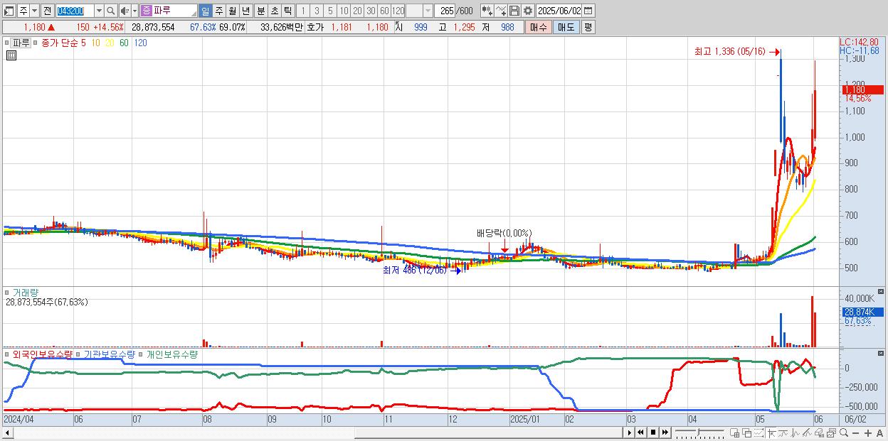 - 파루 (1,180원 ▲ 14.56% , 시총: 493억, 거래량: 28,873,554, 거래대금:336억)