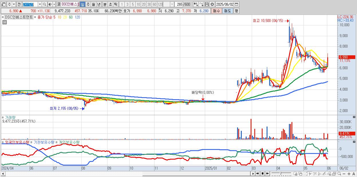 - DSC인베스트먼트 (6,990원 ▲ 11.13% , 시총: 1,887억, 거래량: 9,477,233, 거래대금:662억)