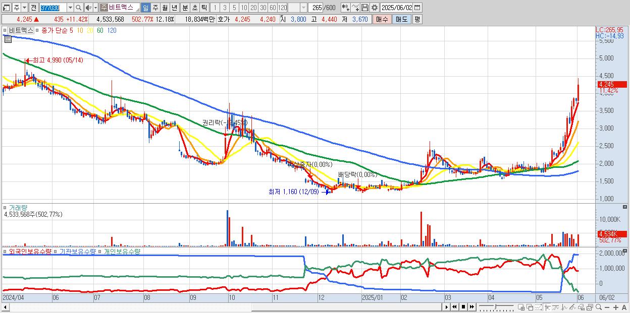 - 비트맥스 (4,245원 ▲ 11.42% , 시총: 1,580억, 거래량: 4,533,568, 거래대금:188억)