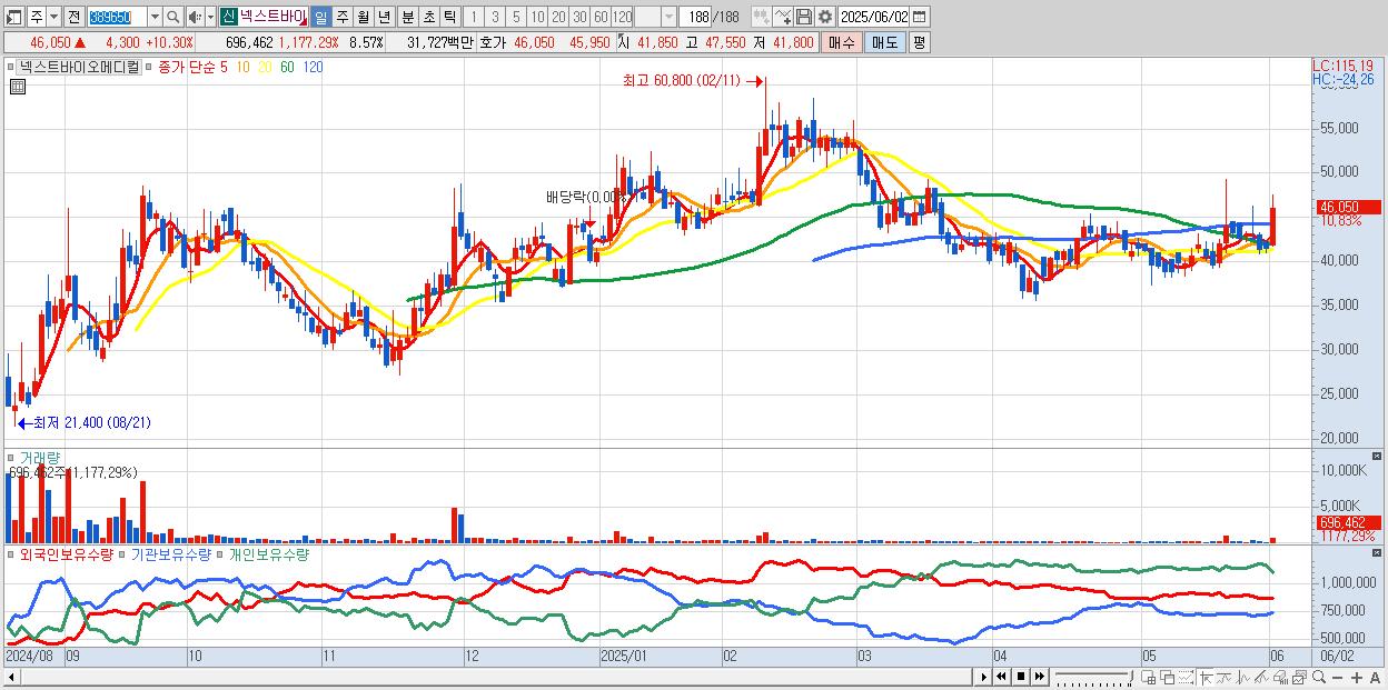 - 넥스트바이오메디컬 (45,750원 ▲ 9.58% , 시총: 3,718억, 거래량: 444,062, 거래대금:203억)