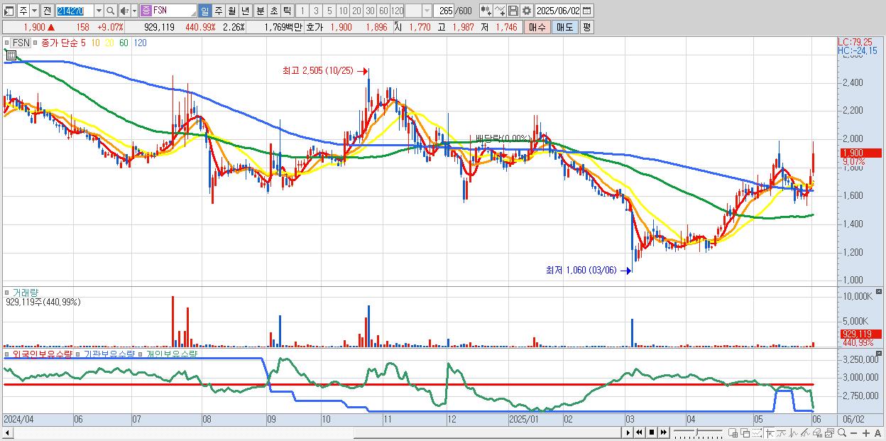 - FSN (1,900원 ▲ 9.07% , 시총: 780억, 거래량: 929,119, 거래대금:18억)