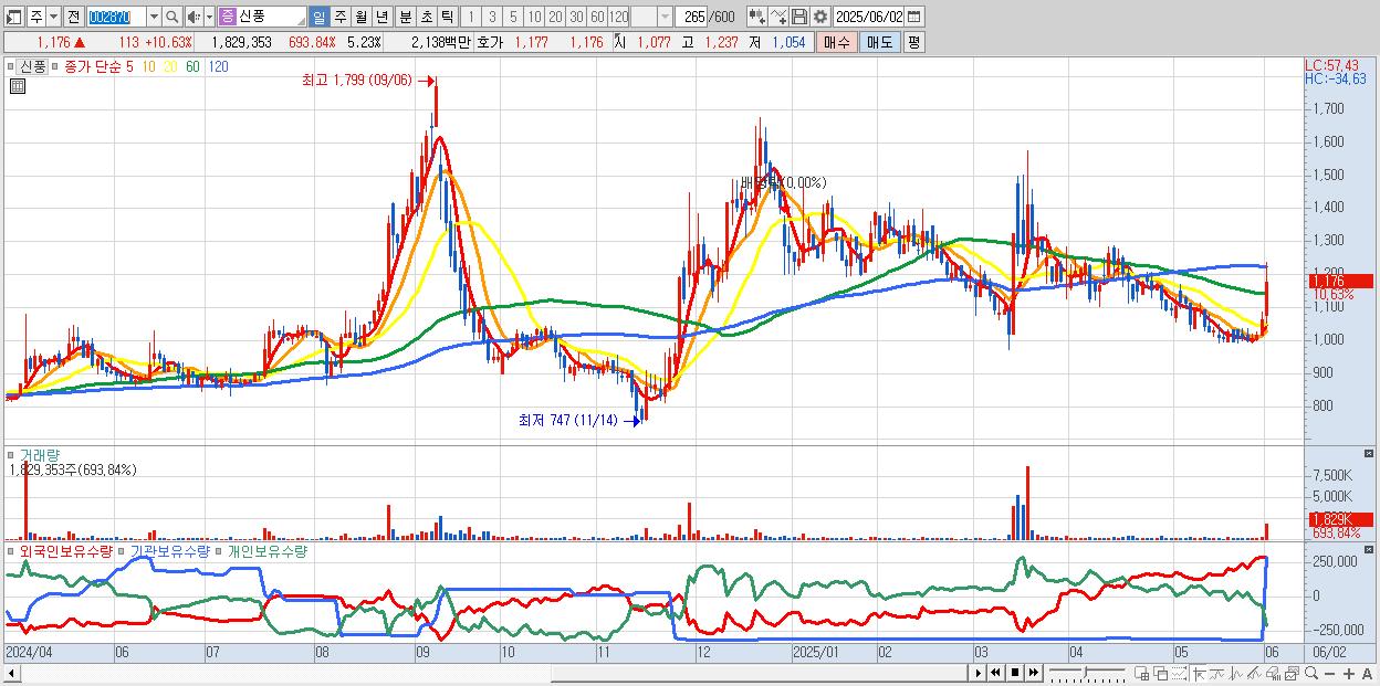 - 신풍 (1,176원 ▲ 10.63% , 시총: 411억, 거래량: 1,829,353, 거래대금:21억)