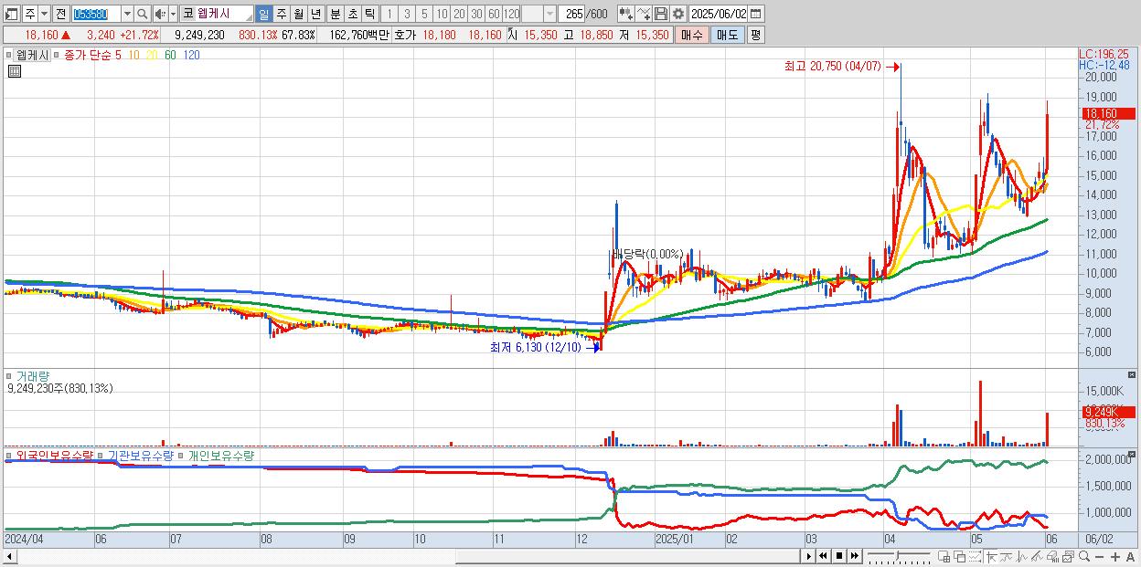 - 웹케시 (18,160원 ▲ 21.72% , 시총: 2,476억, 거래량: 9,249,230, 거래대금:1,628억)