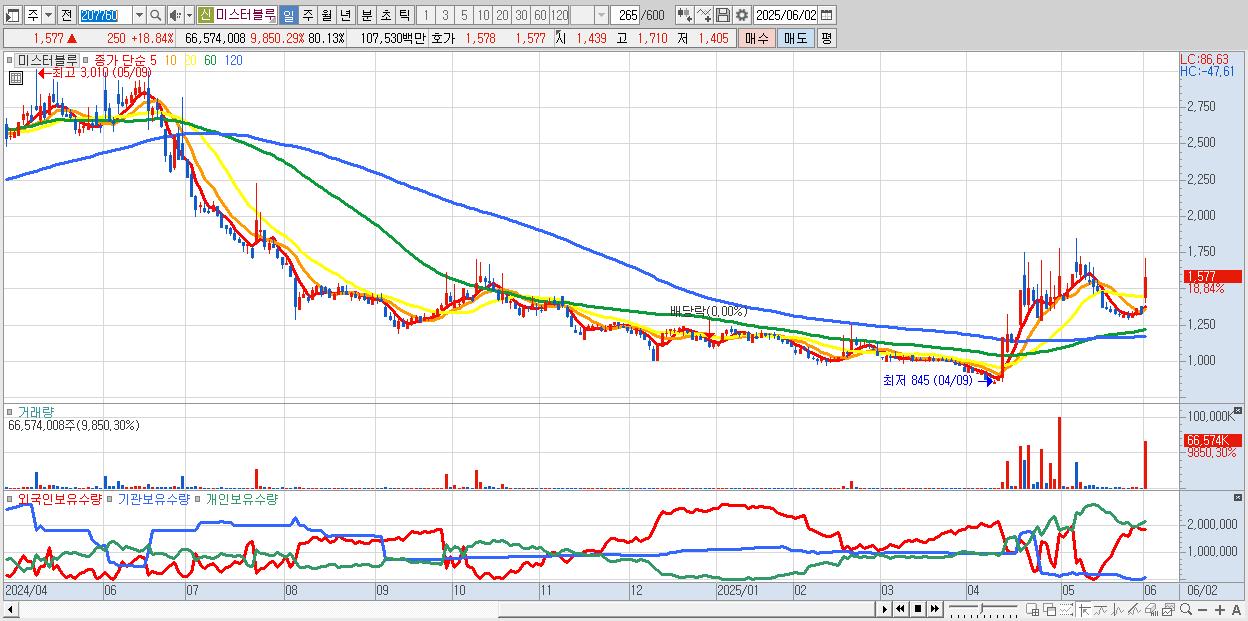 - 미스터블루 (1,577원 ▲ 18.84% , 시총: 1,310억, 거래량: 66,574,008, 거래대금:1,075억)