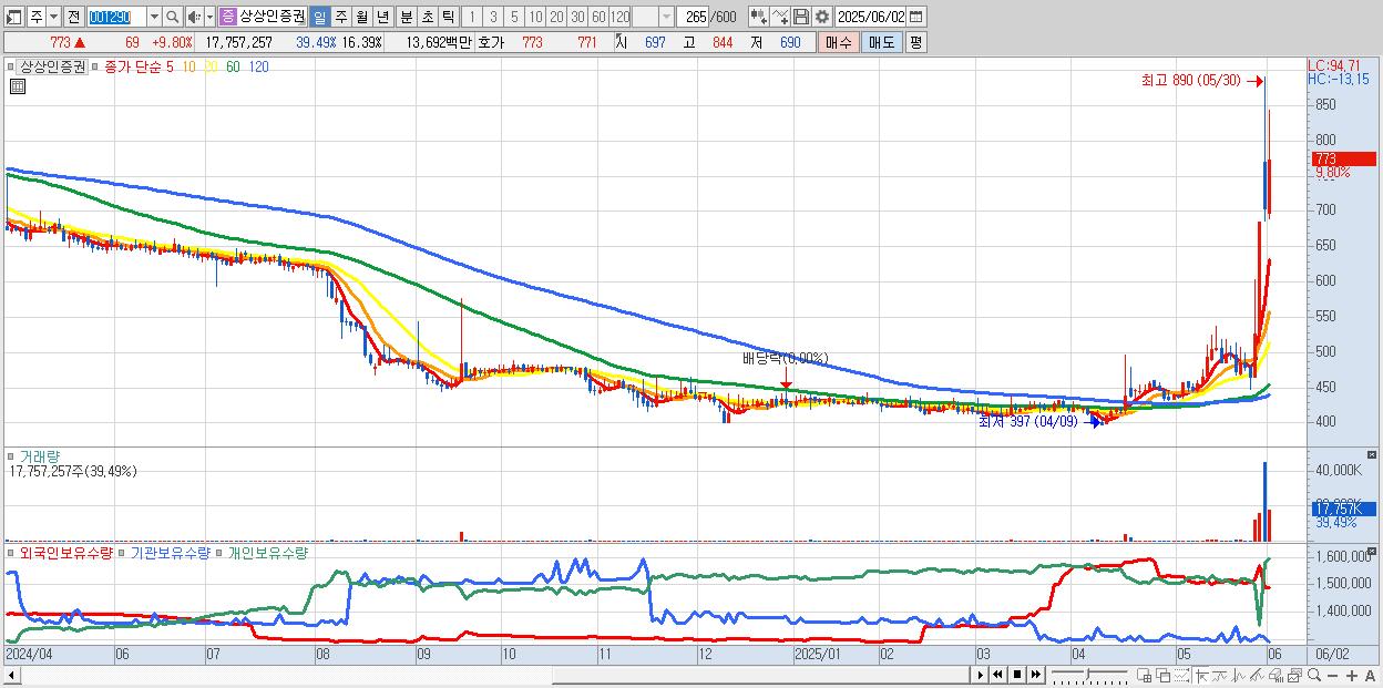 - 상상인증권 (773원 ▲ 9.8% , 시총: 837억, 거래량: 17,757,257, 거래대금:137억)
