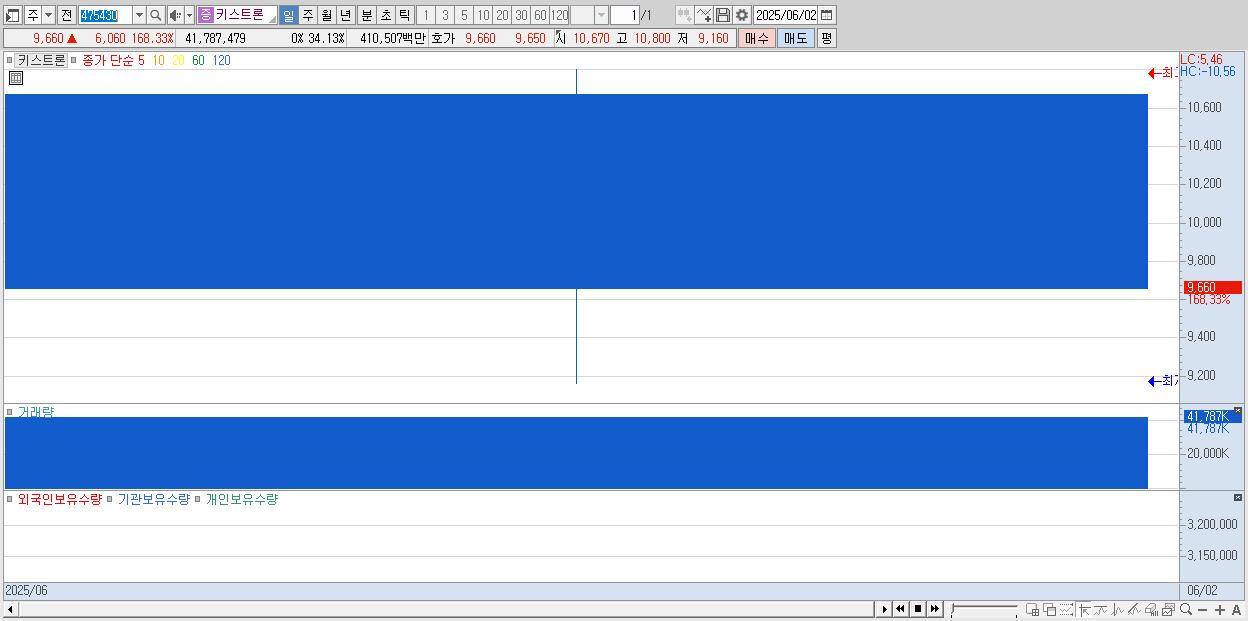 - 키스트론 (9,660원 ▲ 168.33% , 시총: 1,724억, 거래량: 41,787,479, 거래대금:4,105억)