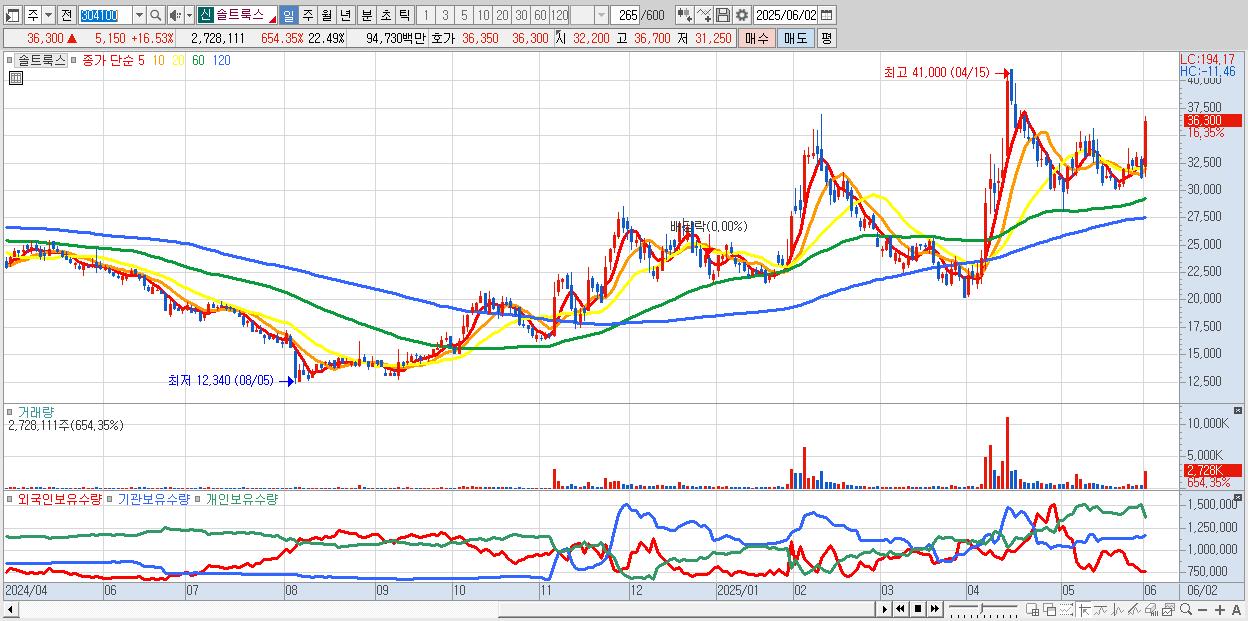 - 솔트룩스 (34,850원 ▲ 11.88% , 시총: 4,228억, 거래량: 1,028,340, 거래대금:352억)
