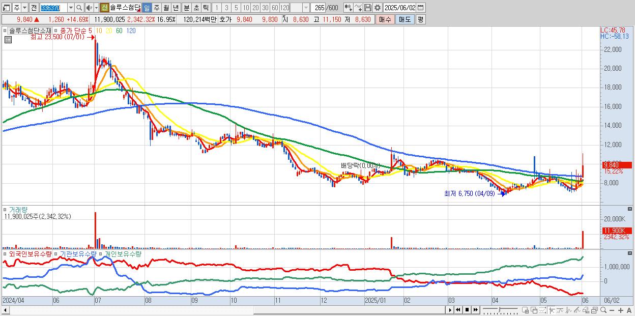 - 솔루스첨단소재 (9,720원 ▲ 13.29% , 시총: 6,825억, 거래량: 5,463,941, 거래대금:554억)