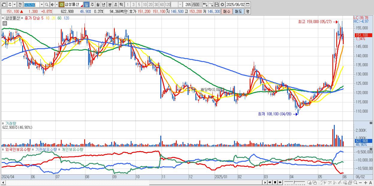 - 삼성물산 (151,300원 ▲ 1% , 시총: 257,175억, 외국인 순매수 거래금:115억)