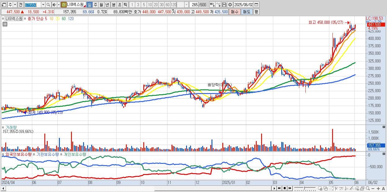 - LIG넥스원 (447,500원 ▲ 4.31% , 시총: 98,450억, 외국인 순매수 거래금:78억)