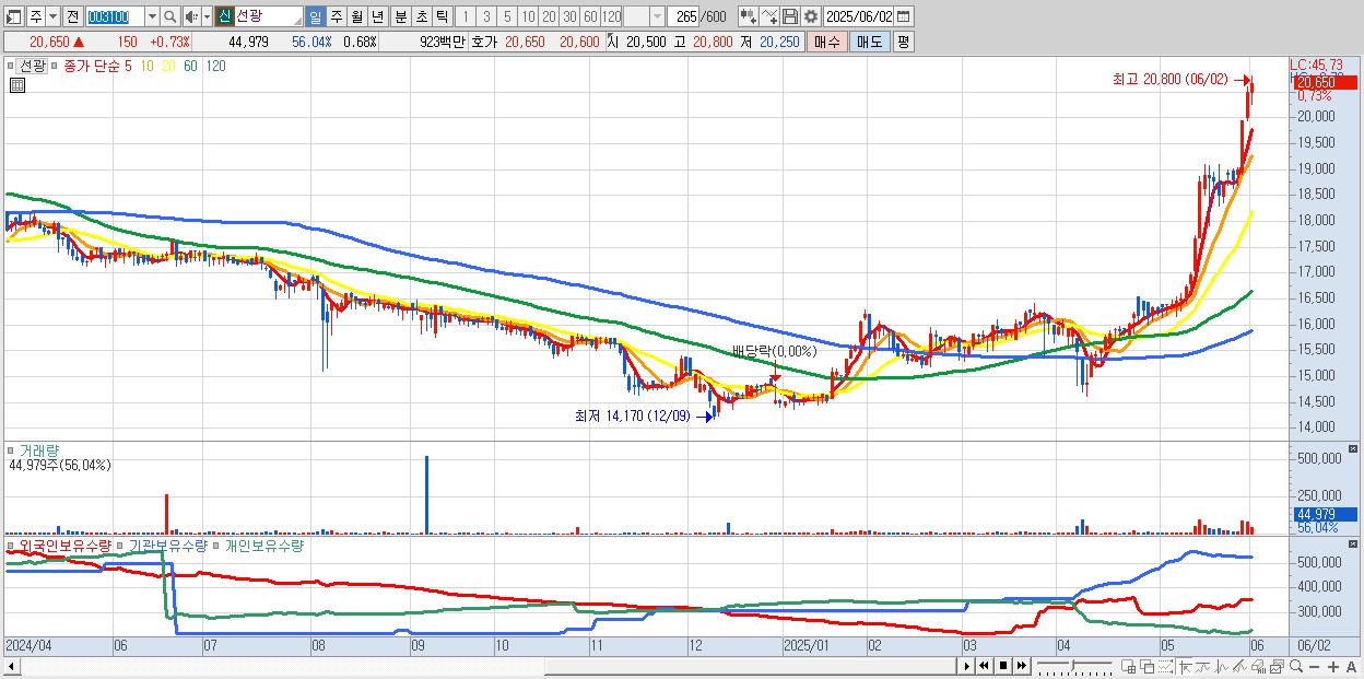 - 선광 (20,650원 ▲ 0.73% , 시총: 1,363억, 거래량: 44,979, 거래대금:9억, KOSDAQ)