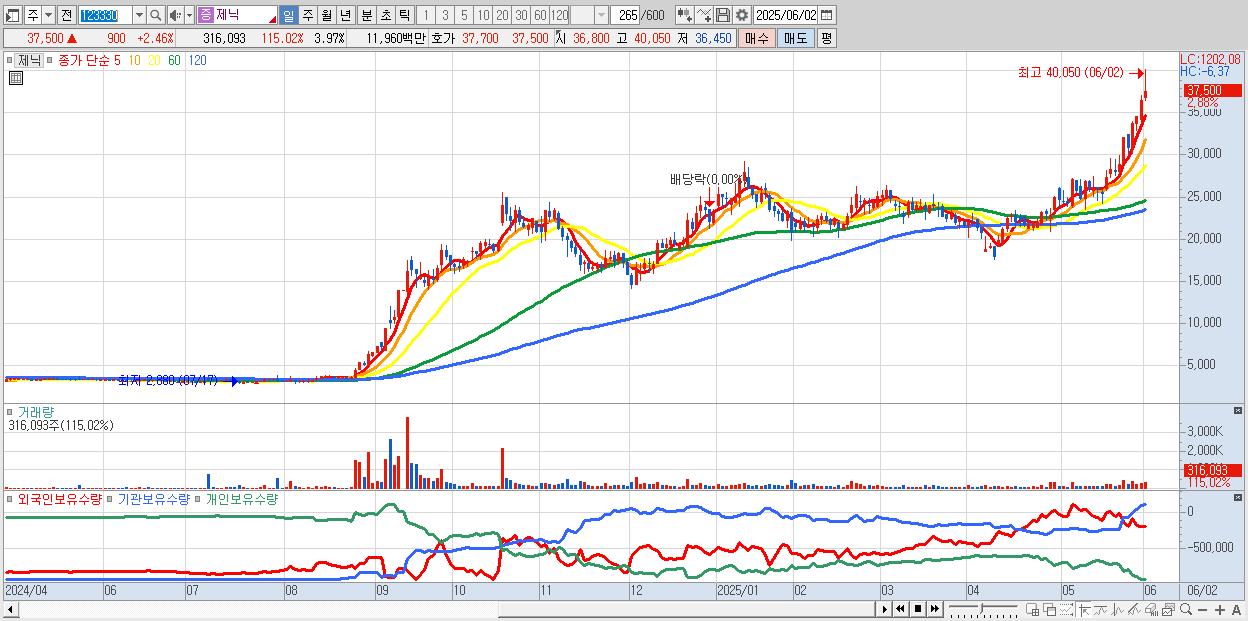 - 제닉 (37,500원 ▲ 2.46% , 시총: 2,988억, 거래량: 224,024, 거래대금:85억, KOSDAQ)